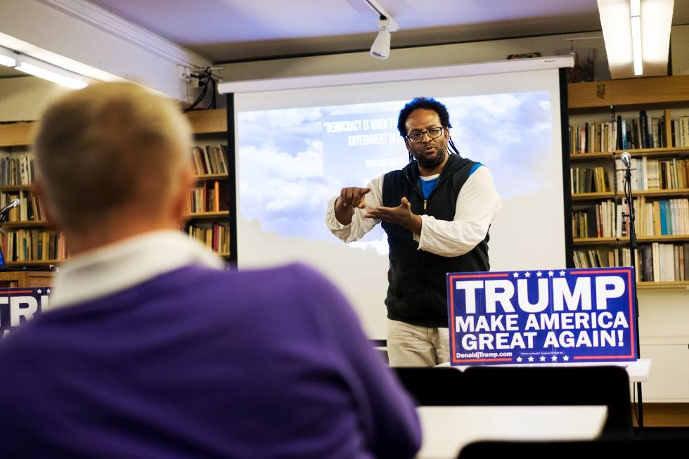 I overkant av 20 mennesker møtte opp på arrangenentet på Litteraturhuset. Forsamlingen var dominert av Trump-tilhengere, men noen få demokrater hadde også møtt opp. Blant dem var oljeingeniør Mark J. Marley.