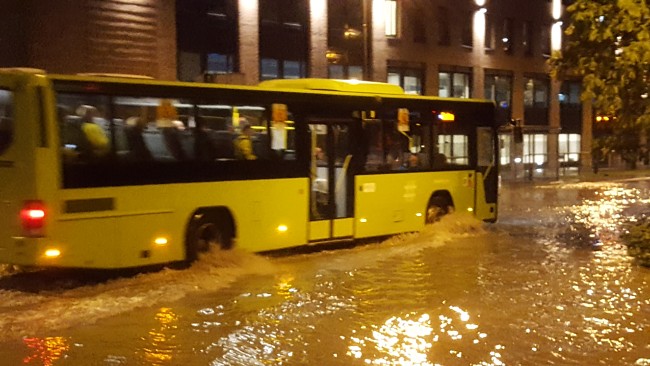 - Det er mye vann som har kommet inn i bygningene på begge sider av Munkedamsveien, og vi prøver nå å få oversikt over hvor store skader det har blitt, sier brigadesjef Tor Arne Elverum til NRK.