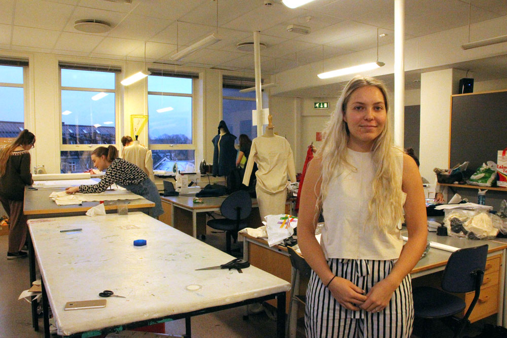 Mote og produksjonsstudentene har for tiden eksamen og jobber iherdig med å lage antrekk. Student og tillitsvalgt Andrea Borgersen Hulbak (20) forteller at mange velger å jobbe hjemme fordi det ikke er god nok plass på skolen.