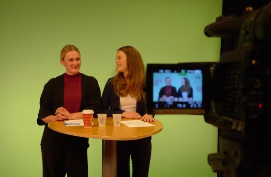 ”Mmm!” ”Bom bim bam!” De ferske journaliststudentene ved Høgskolen i Oslo og Akershus varmer opp stemmen til sin aller første nyhetssending. Nyhetsankere Anna Strand Andersen og Mina Haugli sier de er spente, men ikke så nervøse.