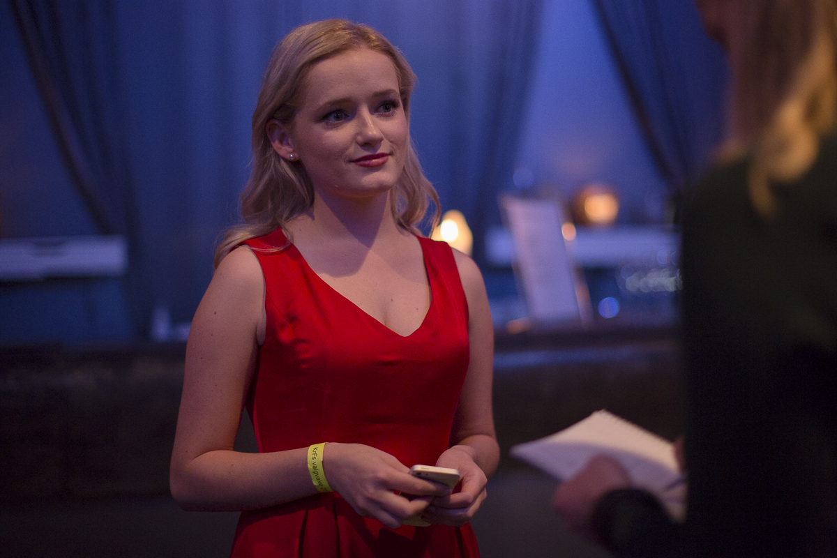 Lederen i Akershus KrFU, Julia Sandstø, befinner seg på KrFs valgvake på Ballroom i Oslo. Sandstø sier hun vil være fornøyd så lenge KrF havner over sperregrensen, og anslår at de vil få 4,5 prosent av stemmene i årets Stortingsvalg. Hun trekker frem at det er nedgangstider for partiet. Nedgangstidene mener hun kan begrunnes med regjeringssamarbeidet KrF har hatt med Høyre og FrP de siste fire årene.