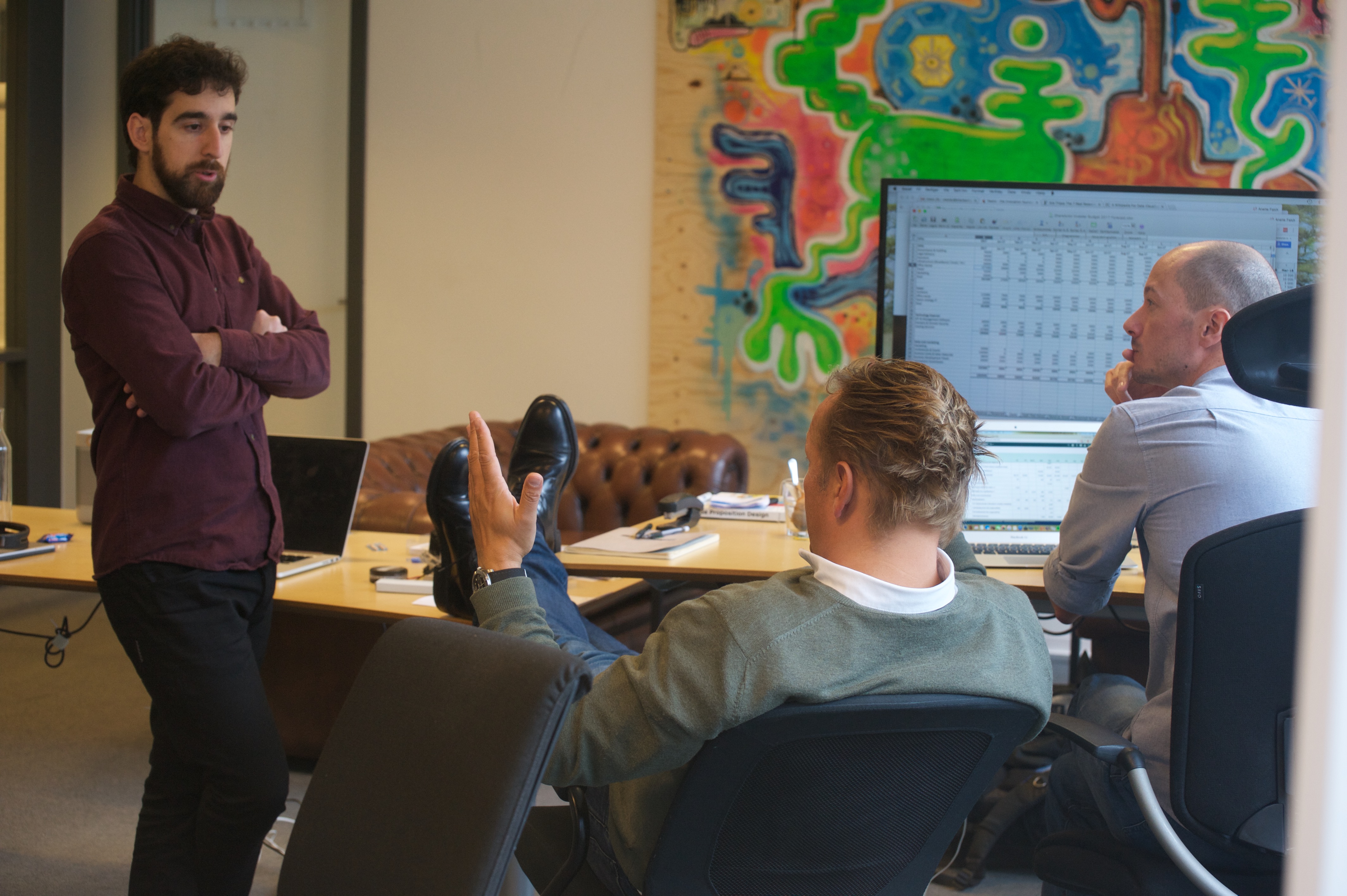 Senere er det tid for det daglige stand-up-møtet til Shareactor – hvor alle på kontoret samler seg foran en pc-skjerm for å snakke med israelske Yonatan Alexander, som sitter i Groningen. Datamaskinen blir plassert på et skrivebord, og de fem som er på jobb kjemper om plass foran skjermen. Under hele samtalen fikler kollegene med en liten rød ball (se bildeserie i bunnen av saken).
