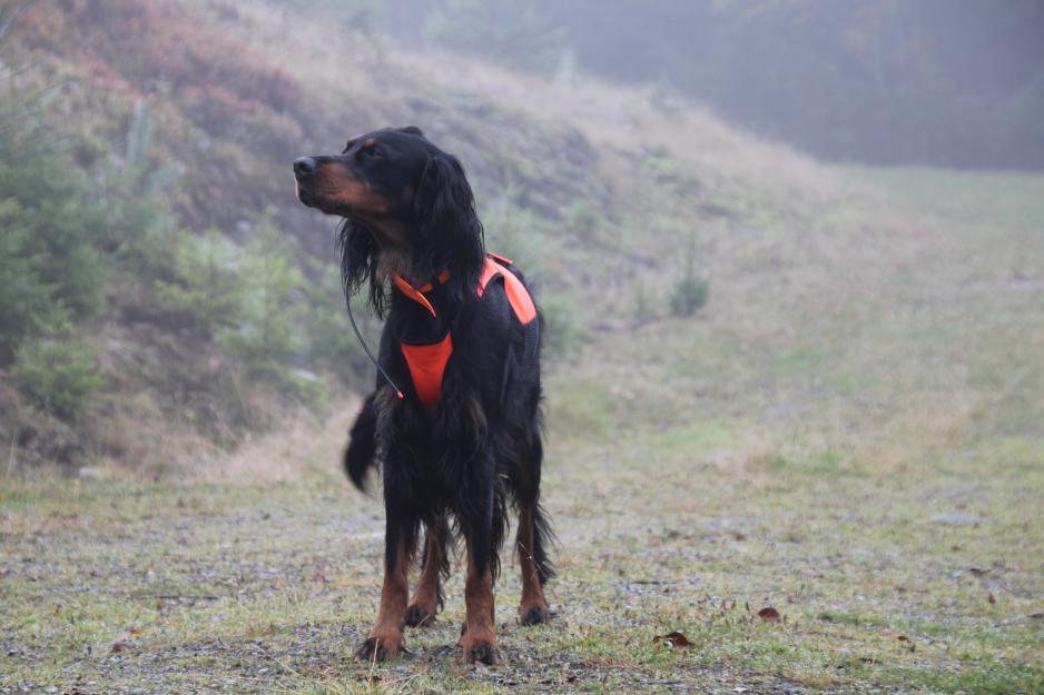 Setteren får på seg en knalloransje vest, og jegeren har den i bånd de første hundre meterne. Han tar av båndet, og med det samme han sier "Gå!" setter hunden av gårde inn i skogen. Det tar ikke mange sekundene før hun er ute av syne. Kenneth dobbeltsjekker at hundens signal dukker opp på den lille skjermen.