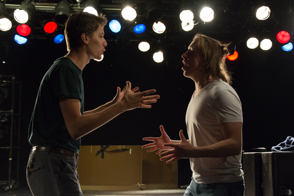 (Fra venstre) Julian Lindseth (24) og Olav Kåre Dønheim (22) gir alt under improworkshop med Shawn Kinley.