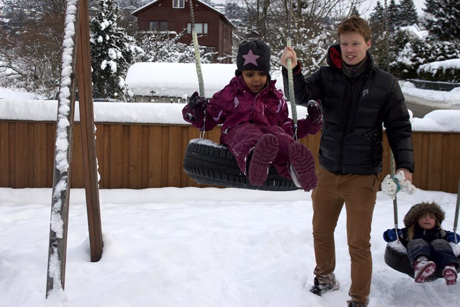 Og trygge er barna. Vi går ut i snøen for å leke litt. Flere av lekeapparatene er gravd opp etter å ha blitt begravd i den store snømengden. Ved huskene blir det kamp over hvem Aasmundtveit kan gi fart til først.
