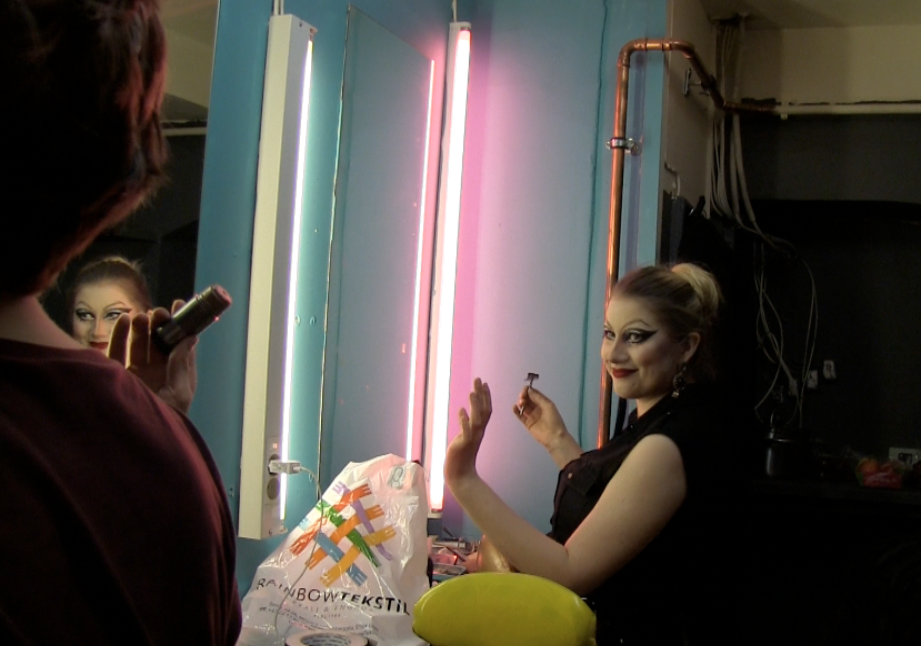 Hovda geleider meg bort fra scenen og inn på bakrommet. Myke sminkekoster, endeløse øyenskyggepaletter, strømpebukser, glitter og korsetter ligger strødd rundt i rommet. Noen sitter lent inn mot speilet, en hjelper en annen på med korsetten, en står i hjørnet og spiser på en hamburger.