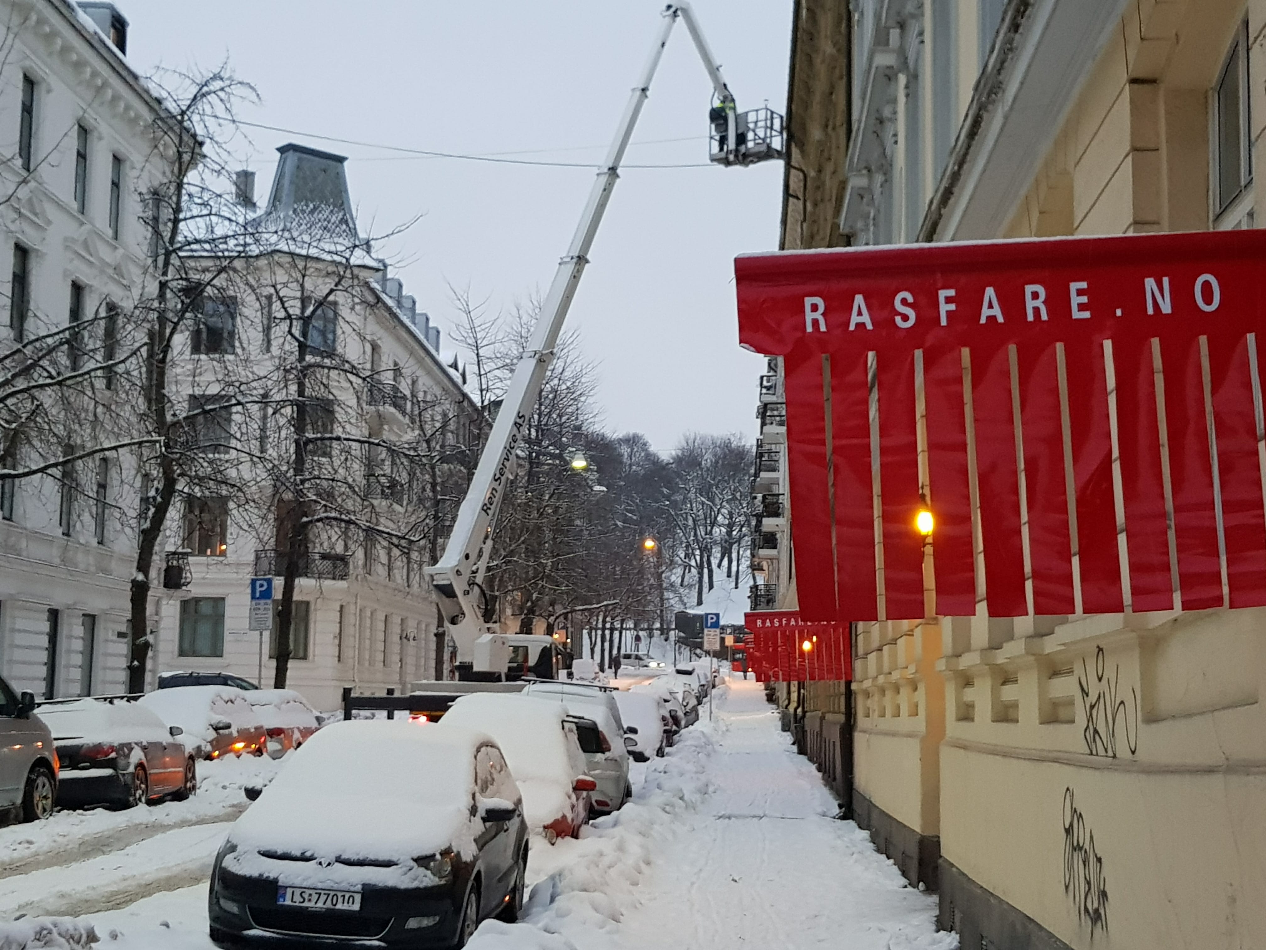 Som et sikkerhetsforetak til istappene blir fjernet, kan du i mange deler av byen finne varselskilt fra rasfare.no. Disse røde bannerne skal vekke forbigåendes oppmerksomhet, men Sison mener at det likevell er en del folk som ikke tar faren på alvor.