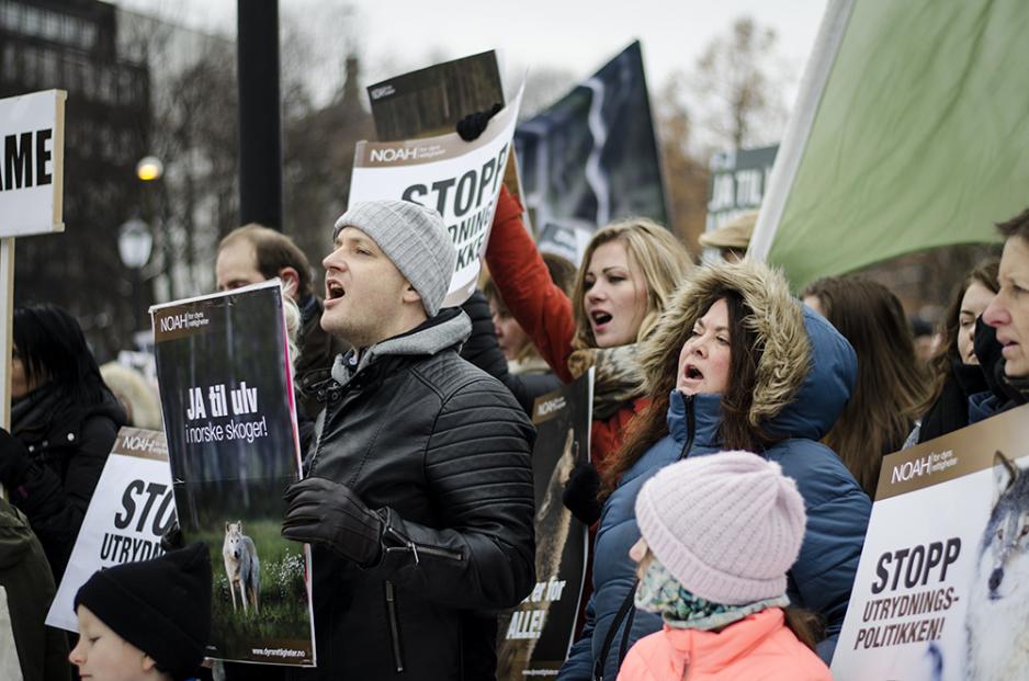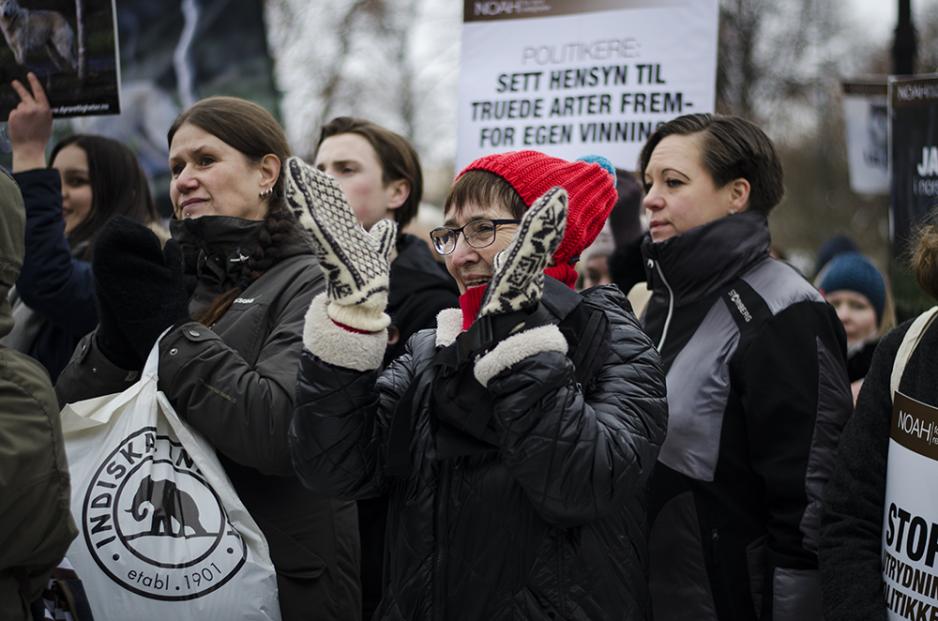 Det er demonstrasjon mot felling av ulv på Eidsvolls plass. "La ulven leve!" og "Ulvejakt er skam, for hele Norges land!" roper demonstrantene engasjert. Til tross for kulden møtte hele 3000 mennesker opp.