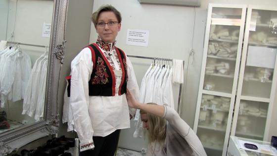 Karin Hansen, butikksjef ved Norske Bunader i Oslo, forteller at det kan være tøft å sitte med selgerrollen når man merker at kundene kjenner på et kjøpepress utenfra.