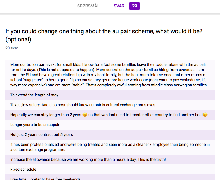 Gjennom en anonym undersøkelse Journalen har gjennomført blant au pairer, ba vi om svar på hva som kunne bedres med ordningen. Flere av au pairene nevner at de ønsker strengere kontroll av ordningen, og noen av dem gir også uttrykk for at vertsfamilier ikke har forstått forskjellen på en arbeidstaker, og en ung person på kulturutveksling: