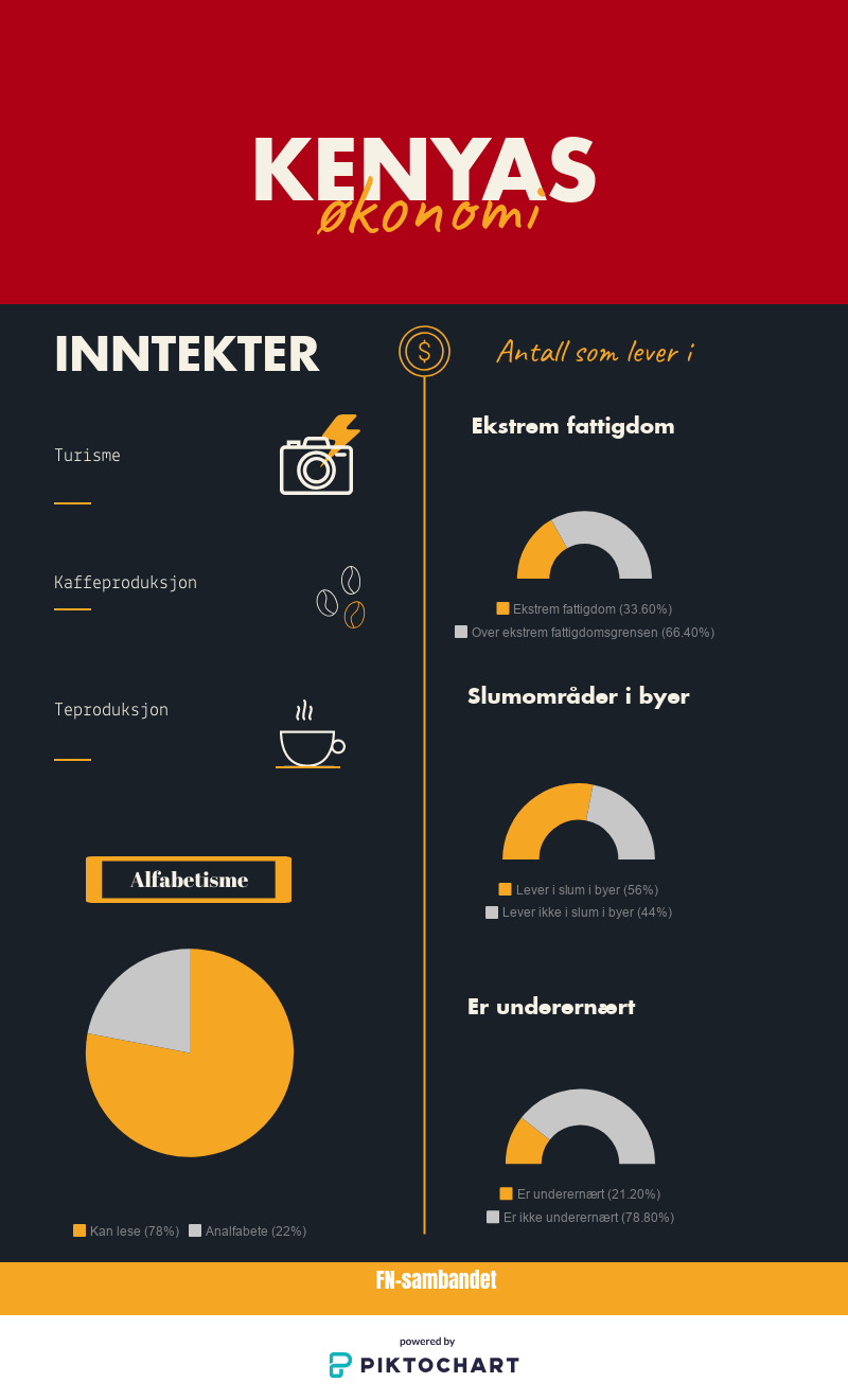 Hele 80 prosent av Kenya er halvørken, og de fruktbare områdene er få. Likevel er jordbruk ryggraden i kenyansk økonomi. Blant de største eksportvarene er te og kaffe.