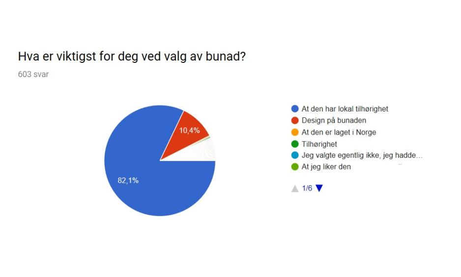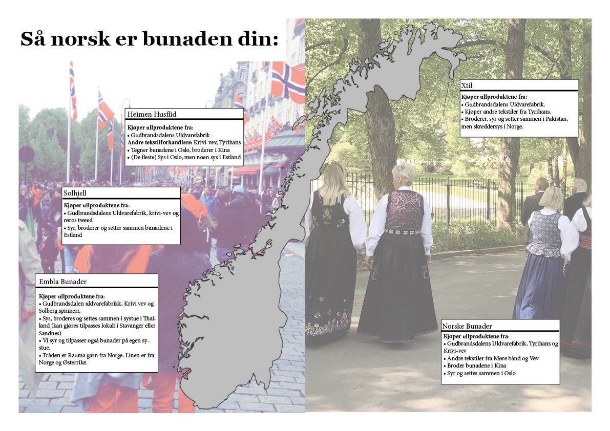 I undersøkelsen svarte 71 prosent at det i stor eller svært stor grad er viktig at bunaden er 100 prosent norskprodusert med klipping, brodering og montering gjort i Norge. Et fåtall av respondentene, 11 prosent, svarte at det er lite viktig eller ikke viktig i det hele tatt hvor bunaden er produsert.