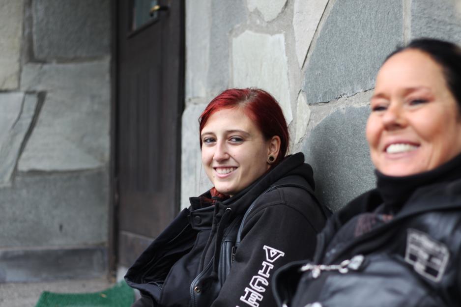 Luften fylles med lukten av grillet hamburger og nystekte vafler. De oppmøtte vender blikket mot de fire svartkledde kvinnene idet de brummer inn på plassen. All oppmerksomhet blir vendt mot dem. Mensen MC går ikke stille i gangene.