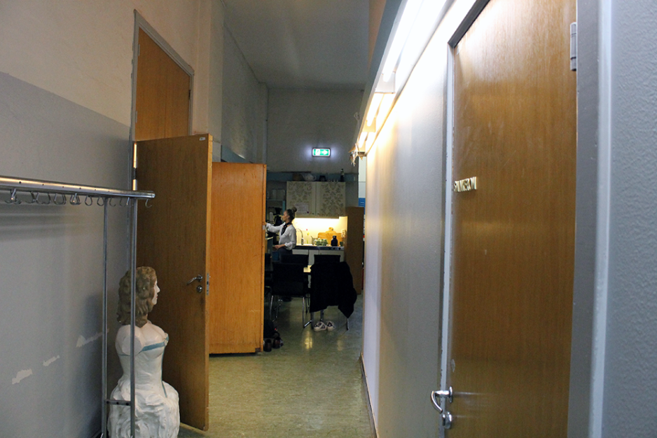 Sara kommer inn i lokalet. Hun hilser lavmælt, men hjertelig på skuespillerkollegaene. De står i salen og snakker muntert med hverandre. Sara går rolig ut og brygger kaffe alene i kjøkkenhjørnet.