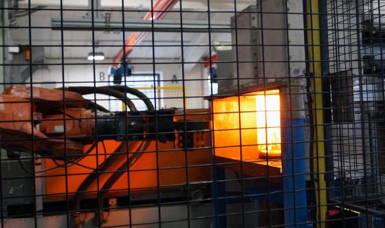 I et bur lenger inn i lokalet, står det en oransje robotarm. Den har som oppgave å flytte den rødglødende stålklumpen fra ovnen den har blitt varmet i, og bort til den enorme pressa som skal gi metallbiten formen den grovt sett skal ha. Varmen stråler mot deg, selv når du står innenfor de gule stripene på gulvet, som markerer hvor det er trygt å gå uten verneutstyr. Flammene skyter opp av stålet når den 700 tonns pressa tvinger det 1500 grader varme metallet til å bli riktig form.