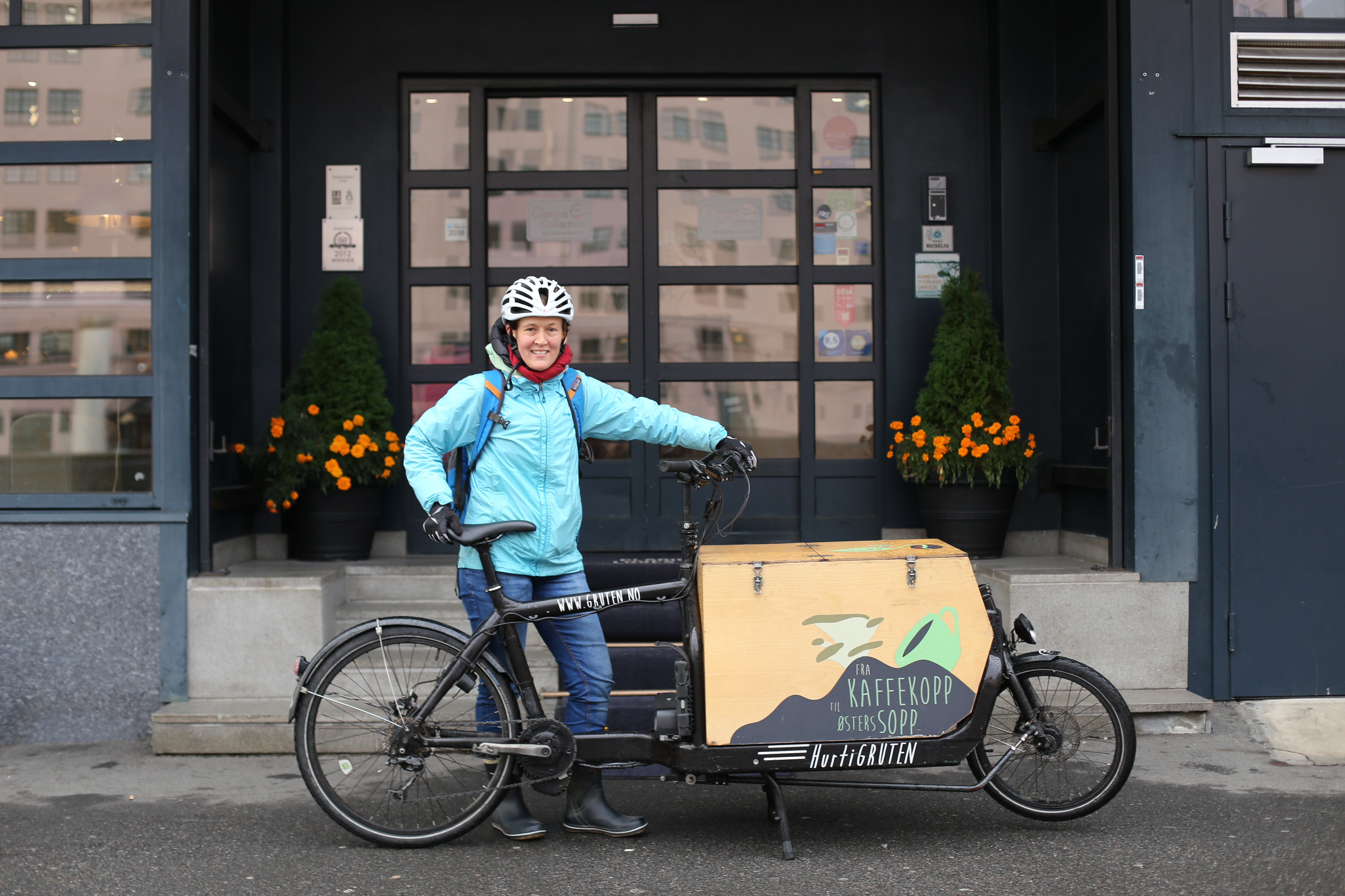 To ganger i uken sykler Mittet og hennes kollegaer rundt i Oslo for å hente gruten fra hoteller, som ellers bare ville kastet kafferestene.
