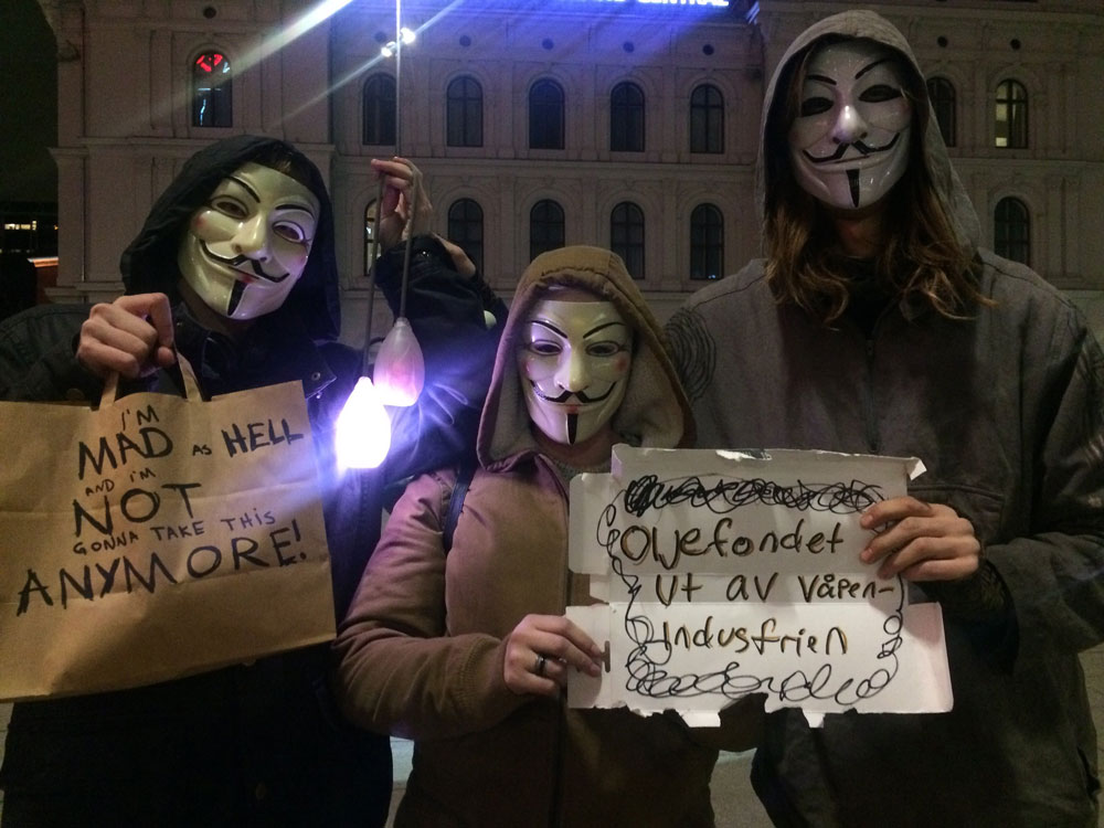 Internett-samfunnet, Anonymous Norge, samlet seg på Jernbanetorget mandag kveld for å demonstrere mot de som misbruker makten sin. - Politikere og toppledere har en forståelse av hvordan de kan påvirke samfunnet til sin fordel, uttaler et av medlemmene.