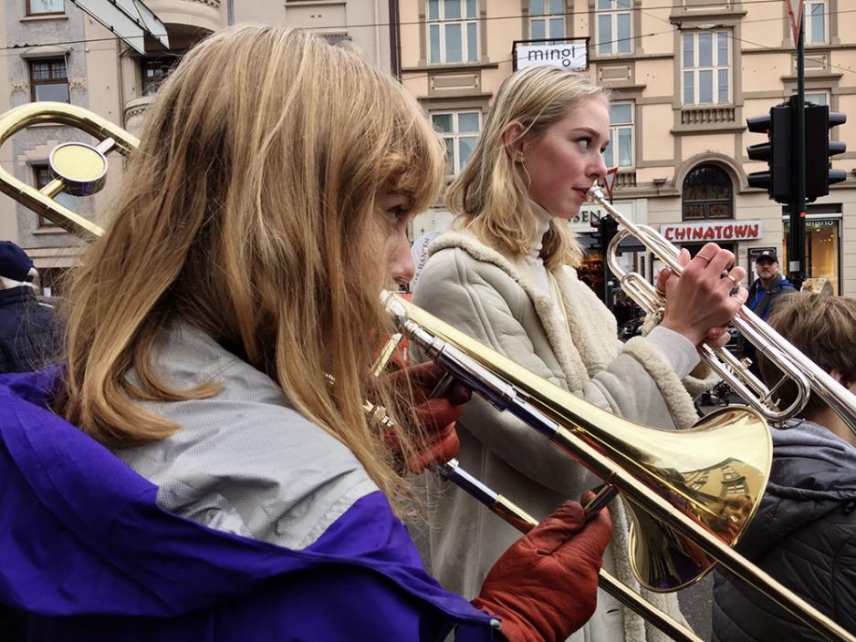 Aase, Isak Kveldro, Simen Kraggerud, Ingvild Dahm og Maja Westum går første året på musikklinjen ved Foss Videregående Skole. De har utrustet seg med instrumenter, kaffe, plakater og vipps for å få så mye ut av dagen som mulig.