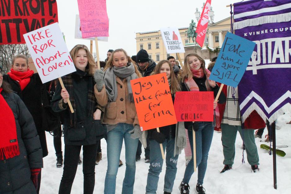 "Vårt liv, vår kropp - fortsatt sjølvbestemt abort" er slagordet som går hyppigast igjen i megafonen til Ane Stø. Mellom sinte slagord tar ho pausar der ho pratar om den nye regjeringa.