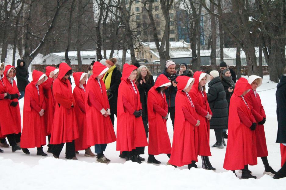 – Vi er alle engasjerte enkeltmenneskjer som gjer opprør mot den nye regjeringa, fortel Celine Helen Kirkeby Gardstad (17) om det raudkledde toget på over 30 kvinner som kunne assosierast med «The handmaids» i HBO-serien «The Handmaid’s Tale».