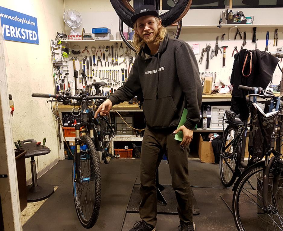 På Oslo sykkelverksted blandes luktene av gummi og olje inn i hverandre. På fem minutter har det vært en kunde innom for å levere sykkelen til reparasjon og en for å hente sykkelen med nye vinterdekk, i tillegg til at telefonen kimer mellom kundene.