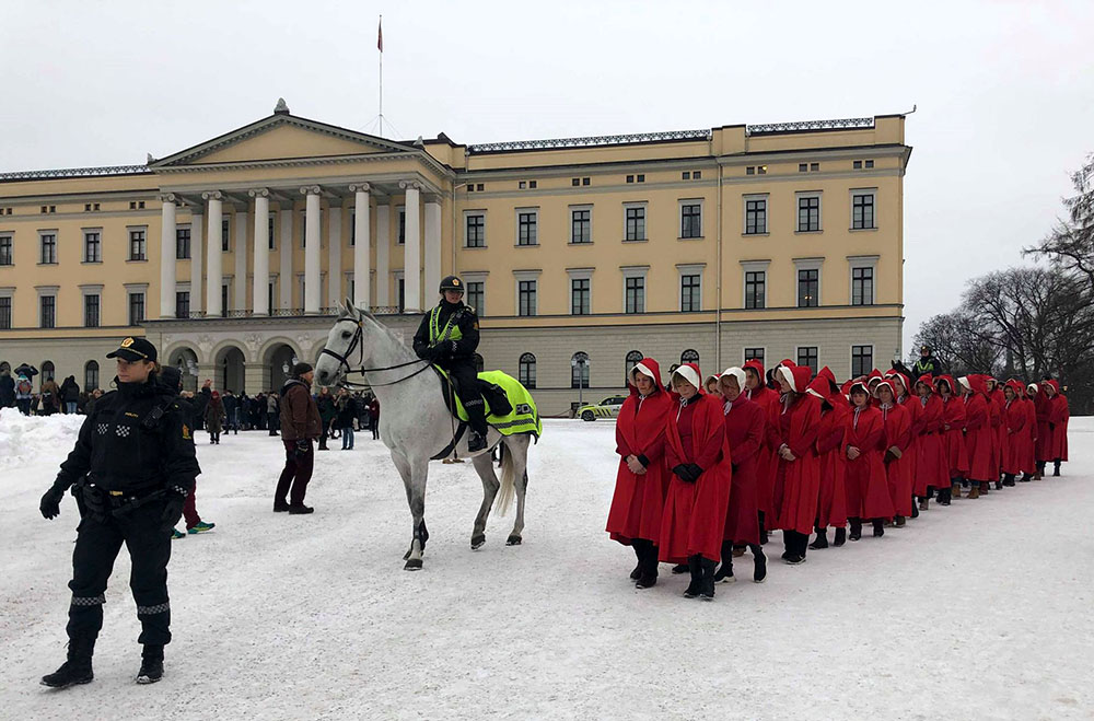 Statsminister Erna Solberg presenterte tirsdag sin nye regjering på Slottsplassen. Her ble de møtt av demonstranter utkledd som kvinner fra HBO-serien «The Handmaid's Tale».