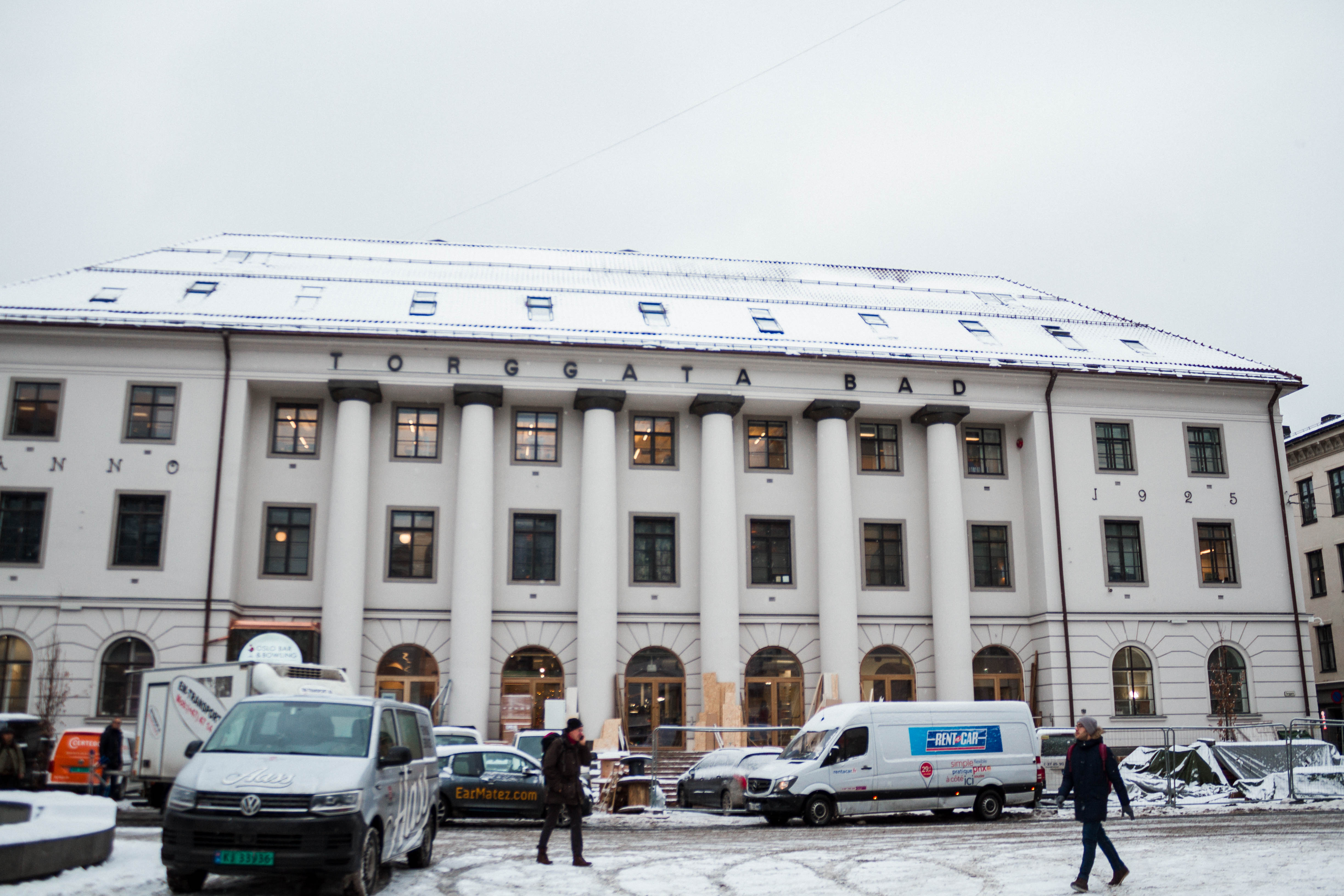 Snøfnuggene faller foran Torggata Bad. De hvite søylene strekker seg mot himmelen og gir bygget et robust preg. En kan lure på hva som skjer på innsiden, ettersom det som pryder inngangsområdet er avfallskontainere, treplanker, sagflis og leveransebiler. Ingen av de godt innpakkede forbipasserende ser ut til å undre seg over lydene og spetakkelet som de store vinduene i første etasje avslører, men neste uke skal konseptet Oslo Street Food fylle de historiske hallene til Torggata Bad.