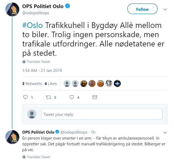 Politet melder at det har vært et trafikkuhell i Bygdøy Allé. De skriver på Twitter, at nødetatene er på stedet og at det trolig vil skape trafikale utfordrigner. Ingen personer skal være hardt skadd, men en person klager over smerter i en arm.