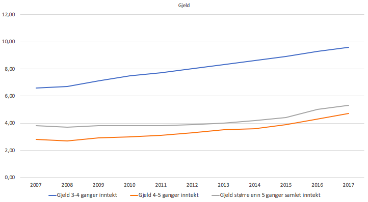 I 2007 hadde 27 prosent av husholdningene en gjeld som var minst dobbelt så stor som samlet husholdningsinntekt før skatt. Denne andelen økte til nær 35 prosent i 2017. Statistisk sentralbyrå peker på høye boligpriser som årsaken til dette. I 2018 avtok denne gjeldsøkningen i følge en en nylig publisert artikkel på SSB.no.