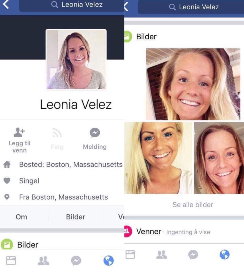 Heller ikke Maren Kristiansen (26) meldte ifra til politiet da hun for to år siden fikk et varsel fra Facebook med en link til en profil som hadde lagt ut bilder av henne. Kristiansen klikket seg inn på profilen som hadde et profilbilde av henne. Under bildet sto navnet Leonia Velez skrevet, en tilsynelatende singel kvinne fra Boston.