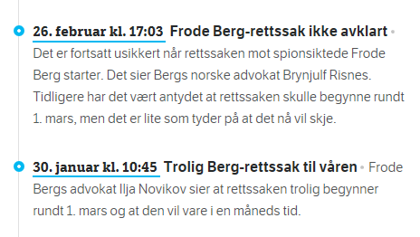 Frode Berg ble arrestert av FSB, anklaget for spionasje, i Moskva 5. desember 2017. FSB mener den tidligere grenseinspektøren, som ble tatt med 3000 dollar i en konvolutt, har jobbet for å skaffe hemmlige dokumenter om den russiske nordflåten. Frode Berg har erkjent at han var på oppdrag for norsk etteretningstjenste, men nekter for at han visste hva som var hensikten med oppdraget.