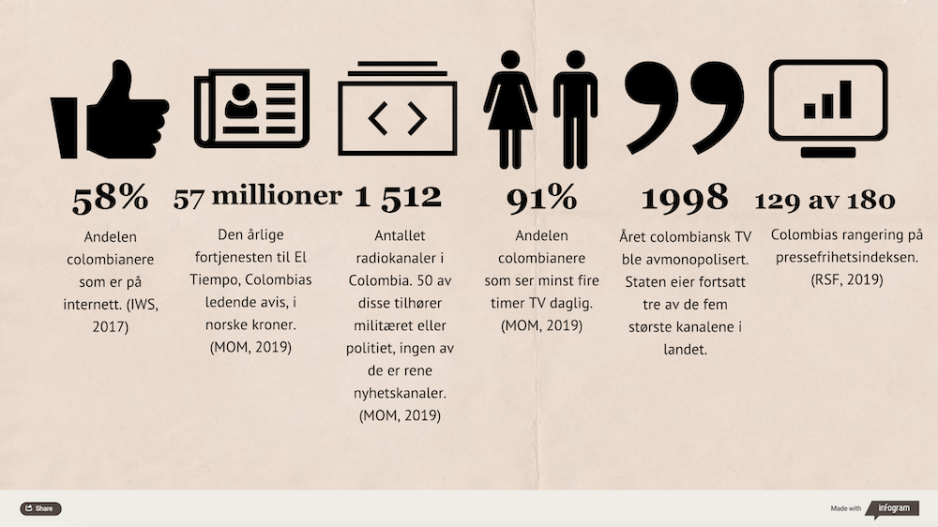– Store deler av colombianske medier eies av et fåtall rike familier, eller mektige næringsinteresser. Det siste ser vi også i Norge, men her går ikke eiere inn og dikterer redaksjonelt innhold, sier Krøvel.