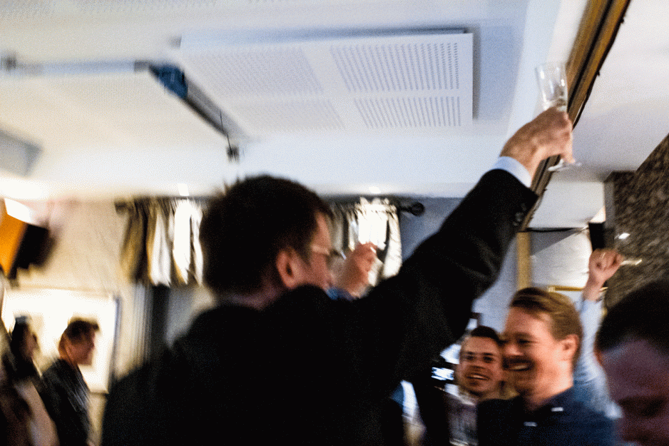 Selv om hovedresultatet er flere timer unna er lokalet i feststemning og fylt av både glede, store smil og sjampanje. Partimedlemmene gleder seg og er spente på fortsettelsen av kvelden. Som kan se ut til å ende med et brakvalg for det ferske partiet.