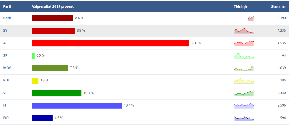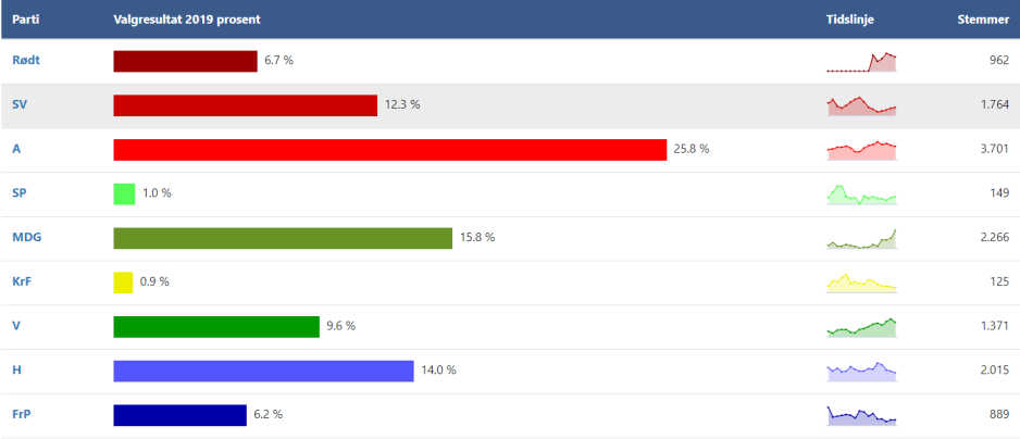 KrF (0,9 prosent) og Rødt (6,2 prosent) gjorde det også dårligere enn i 2015.