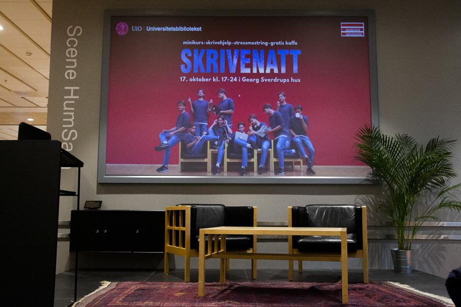 På torsdag arrangerer Universitetsbiblioteket i Oslo Skrivenatt for alle studenter. Der kan du blant annet delta på minikurs og få skrive veiledning.