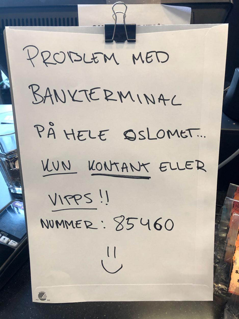 Torsdag 31.oktober var kortterminalene nede i SiO-kantinene på OsloMet. Studentene måtte betale med Vipps eller kontant.