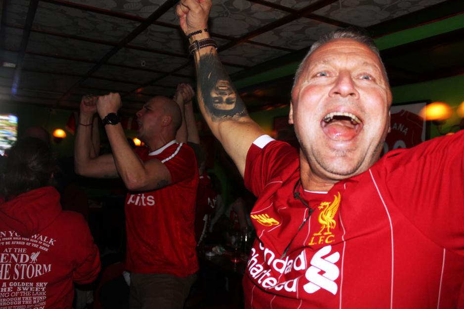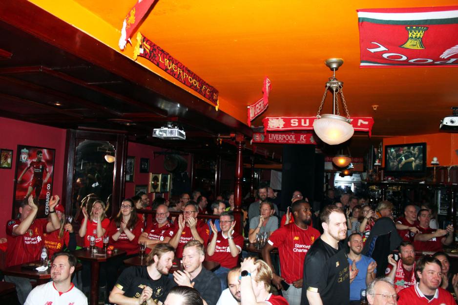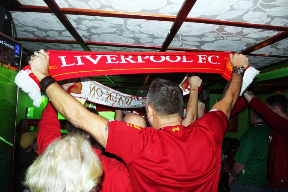 Liverpool har akkurat gått opp i ledelsen mot erkerivalen Manchester United. De fremmøtte retter med det verbale stikk mot deler av hovedstadens United-sympatisører, som befinner seg på Scotsman i Karl Johans gate.