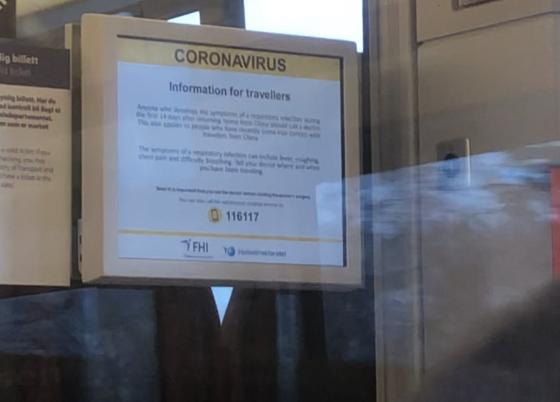 Vy har informasjonsskjermer som informerer om coronaviruset på norsk, engelsk og kinesisk.