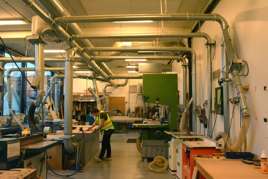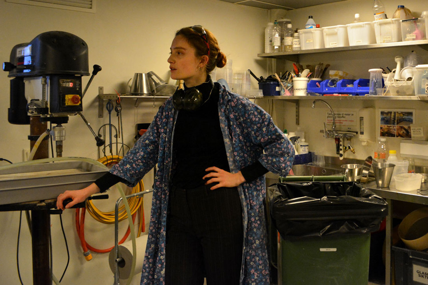 Fra ett verksted til det neste, fulle av verktøy og materialer. Mulighetene tar aldri slutt. Det kryr ikke av studenter, men det er noen i nesten hvert rom. Fra et rom til et annet forandrer lyden, lukten og luften seg. Studentene beskriver det som sin egen lille verden, her nede i kjelleren på Kjeller.