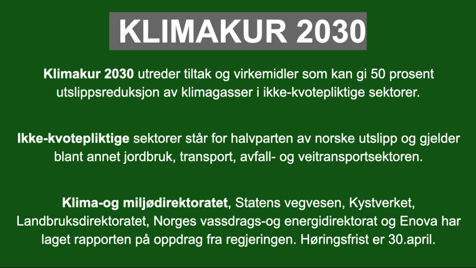 Rapporten Klimakur 2030, som Miljødirektoratet la frem i slutten av januar, foreslår å kutte jordbruksutslipp med 5,1 millioner tonn. Den slår blant annet fast at redusert kjøttinntak og kjøttproduksjon kan føre til store utslippskutt.