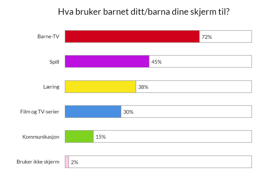 I Journalens spørreundersøkelse, svarer 72 prosent av småbarnsforeldrene at barnet bruker skjerm til å se på barne-TV. 45 prosent oppgir at barnet bruker skjerm til spill, og 38 prosent sier at skjermen brukes til læring.