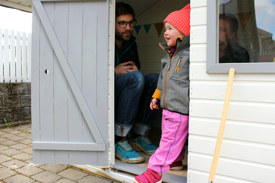 Inne i huset har stuen, som normalt har vært et oppholdssted for de voksne, blitt omgjort til et provisorisk lekerom for Alva (6 mnd) og Linnea (2 ½ år). Som i alle småbarnshjem ligger lekene strødd som små fallgruver utover gulvet, og diverse spill er stablet fra gulv til tak. I det ene hjørnet har Linnea et eget lite kjøkken komplett med både vask og komfyr. Hun sitter på gulvet og trykker ivrig på en iPad, mens pappa følger med.