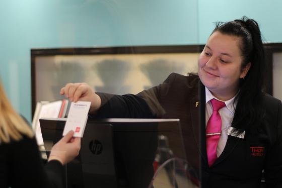 Hotellets lobby er bredt og åpent, noe som tyder på at hotellet ofte huser mange mennesker på en og samme tid. På denne søndagen er det likevel stille. Beskjedne tastetrykk fra et PC-tastatur er den enste lyden som brer seg ut i det store lokalet. Den lange resepsjonen har fire ulike dataskjermer bak disken, men i dag er hotellresepsjonen bare bemannet av en person. Maibel Riives jobber som resepsjonist for Thon Hotel Arena. Her har hun jobbet siden september i fjor.