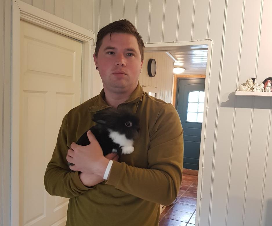 I toppleiligheten lager husets kanin et voldsomt spetakkel i buret ved inngangen til stua.