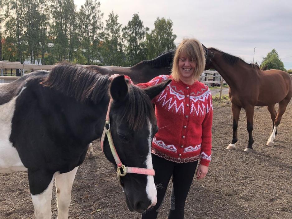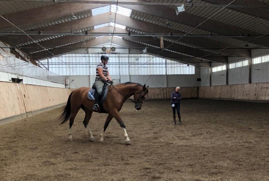 Den spontane ridetimen er over, og Thea trer av hesten. Hun er selv ridelærer, men mener hun lærer noe nytt hver dag.