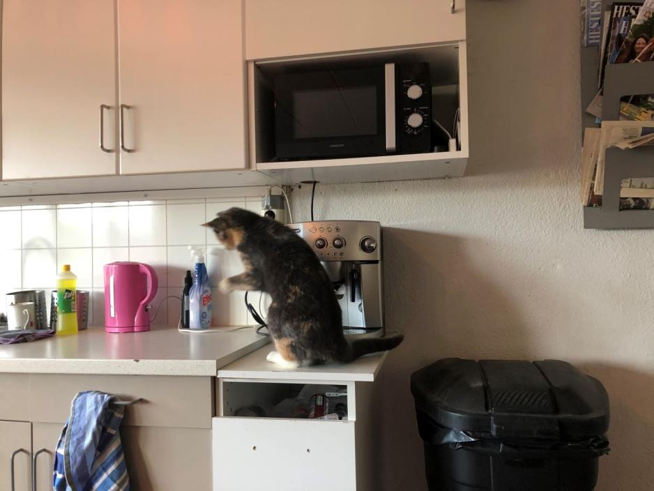 Den ene katten sitter på søppelkassen og iakttar fluene på kaffemaskinen. Ingen reagerer når den hopper opp på kjøkkenbenken i mordforsøket.