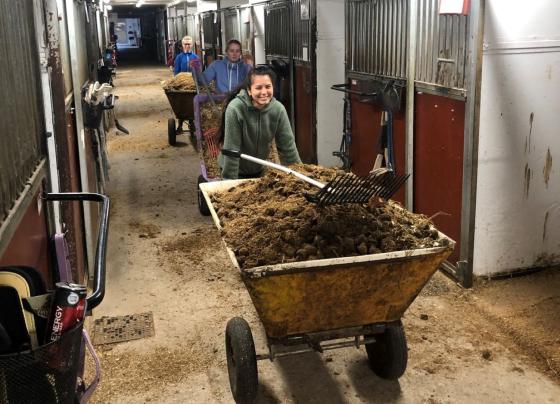 En stram eim av hestemøkk og høy henger over stallen, men jentene enser det ikke.
