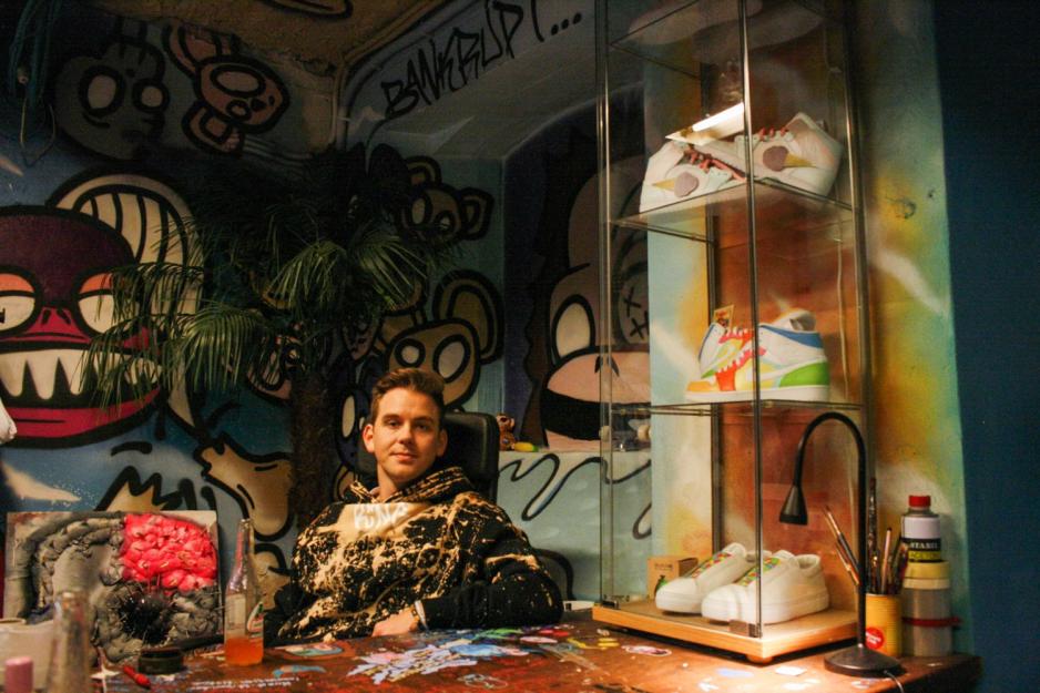 Tor-Oscar kommer tilbake og setter seg i kontorstolen. Ovenfor custom sneakers han selv har designa. Veggene er malt, med kunstnerisk grafittistil.