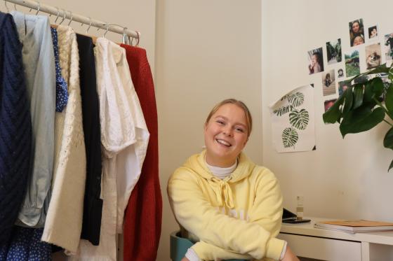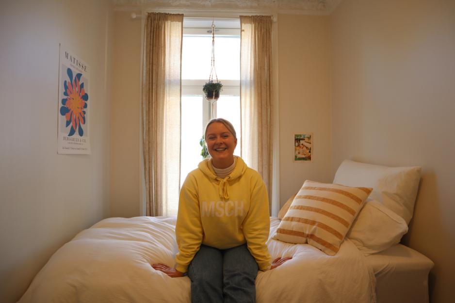 Solveig har på seg en gul MSCH hettegenser og vide olabukser. Klesstilen passer perfekt inn i det livlige soverommet med planter, bilder på veggene og pynteputer i senga. Soverommet er lite, men har akkurat plass til en seng, et skrivebord og et klesstativ.
