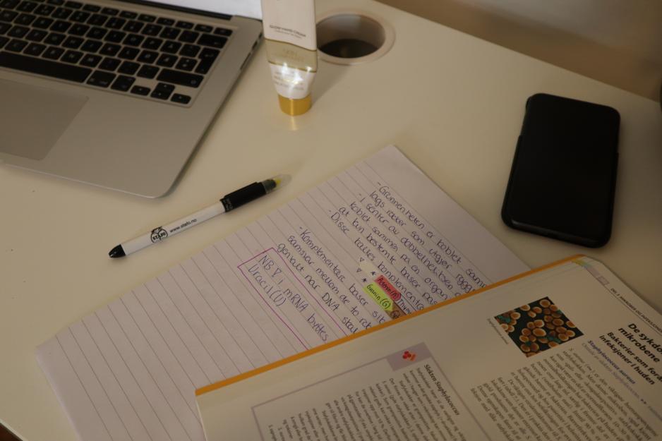 Tidligere i dag hadde Solveig Zoomundervisning på 45 minutter, nå jobber hun med selvstudier. I en leilighet med mange gjøremål og gode venner, er det lett å bli distrahert. Da skal det ikke mye til før man skyver skolearbeidet unna.
